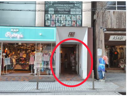 「三木楽器前」の「西海岸・Rubys」右横のエントランス「AS」がビル入り口です。 そのまま奥へ進みエレベーターで8階が「占いラピス」です。 |